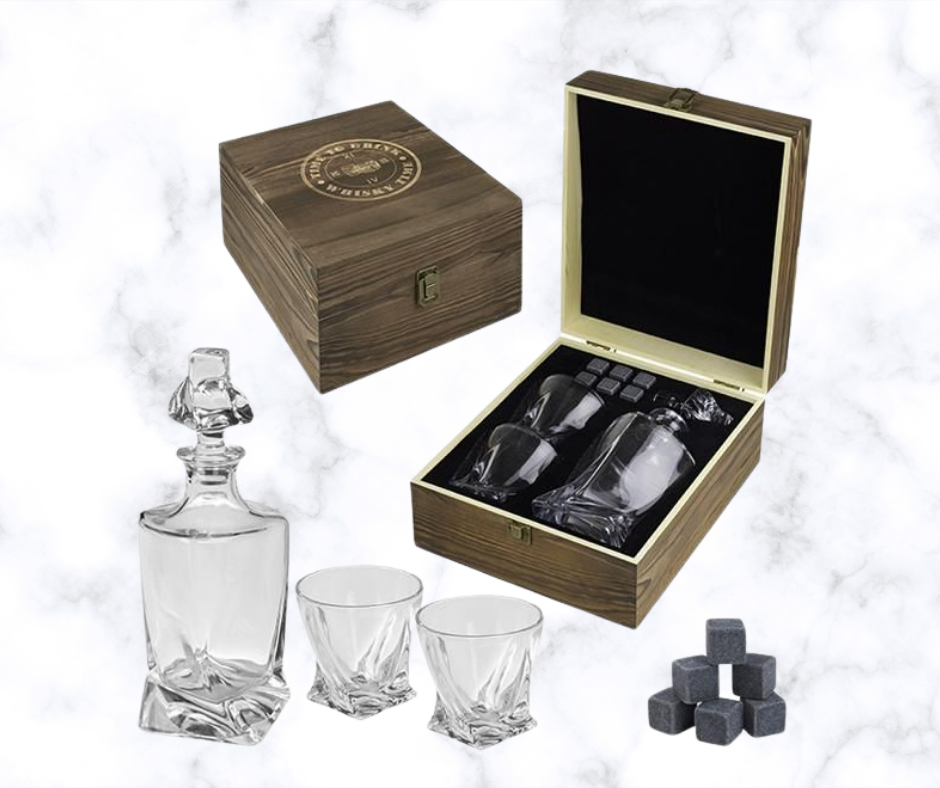 הכולל דיקנטר cc800 שתי כוסות ויסקי 6 אבני ״קרח״ אבן בזלת טבעית 15x26x31 ס״מ עם חרייטה בלייזר