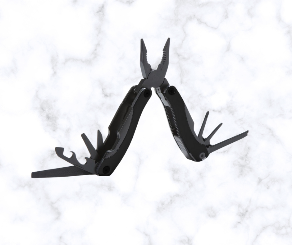 כלי רב שימושי עם 13 פונקציות שונות עשוי מתכת מושחרת, עם פאוץ’ נשיאה 23.5 ס"מ כולל חריטה בלייזר